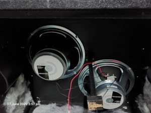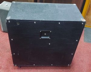 I believe it’s marine-grade ply, and the speakers are a pair of 75w Celestion G12T-75s. They’re broken in and sound great. The cab runs at 8 ohm and is deceptively light and compact. Condition is good, it’s been gigged so does have a few scratches on the tolex but nothing serious. It has castors fitted, dimensions = 67cm wide, 34cm deep, 70cm high including the castors.